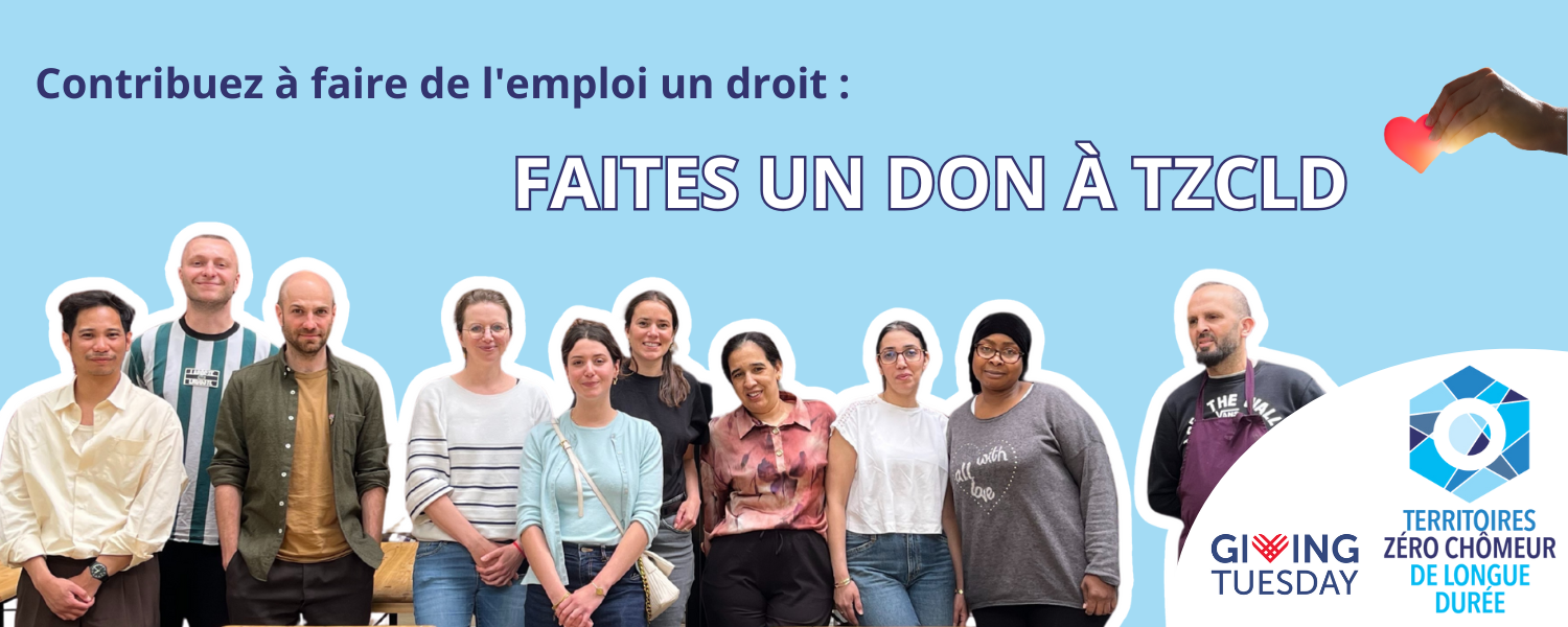 TZCLD a besoin de vous ! Quel que soit le montant de votre don, engagez-vous à nos côtés pour mettre fin à la privation d'emploi et mettre en œuvre le droit à l'emploi en créant des emplois durables et utiles. En donnant à Territoires zéro chômeur de longue durée, vous contribuez à aider les personnes privées d'emploi à retrouver confiance et dignité, grâce à un emploi salarié en CDI et à temps choisi, et vous contribuez à renforcer la solidarité dans les territoires.